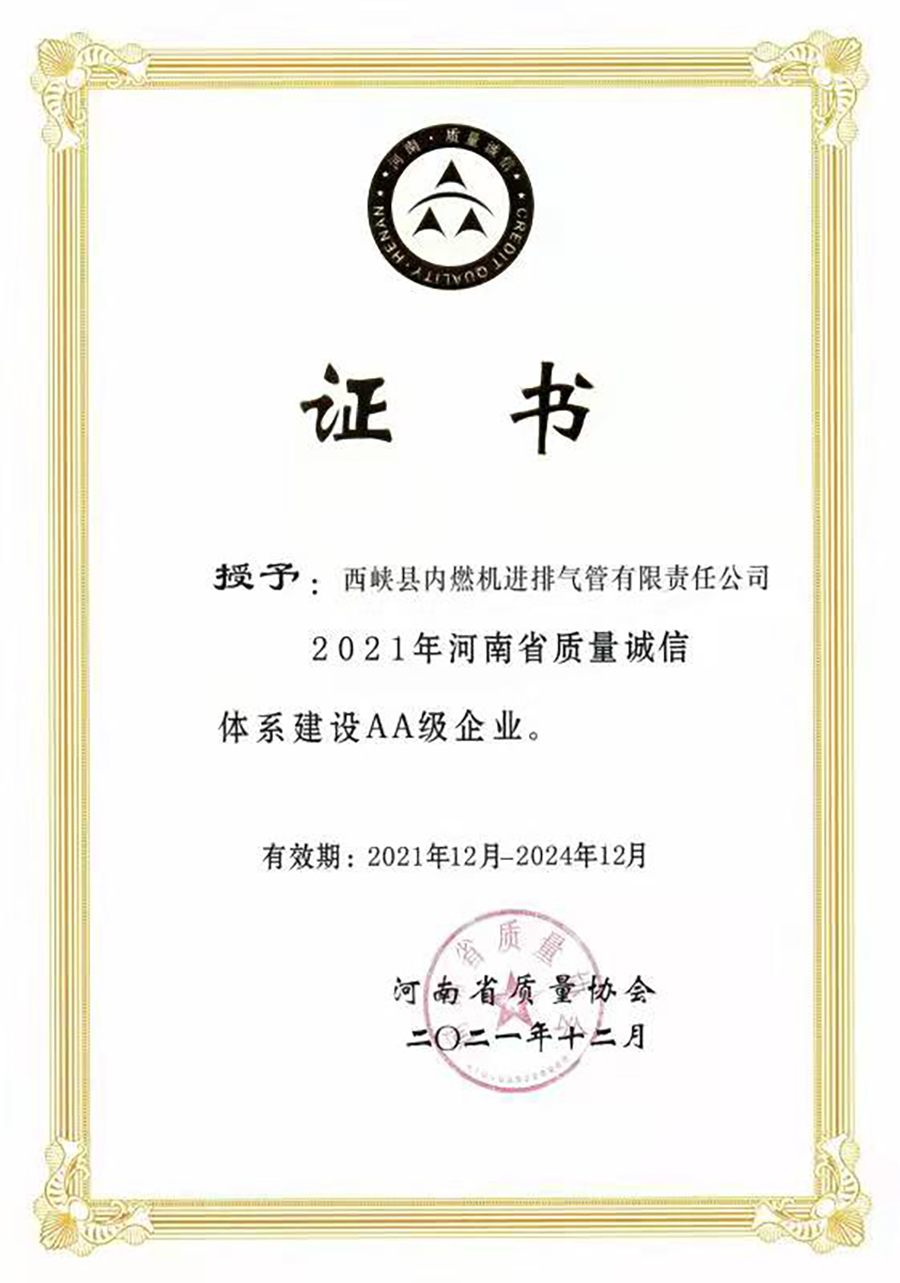 公司被河南省质量协会授予“2021年河南省质量诚信体系建设AA级企业”。